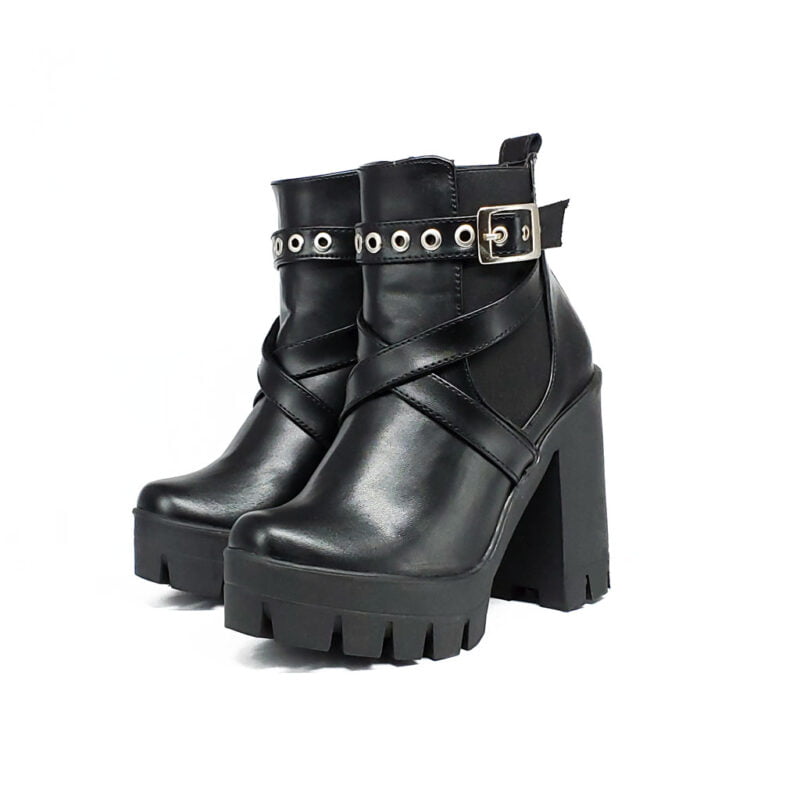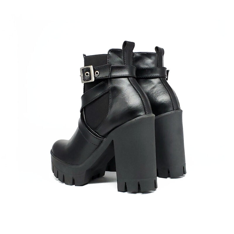 Bota para Mujer Elaborada en Cueros Sintéticos de alta resistencia y duración , montada en suela de Caucho TR antideslizante , esta Suela ofrece comodidad y confort a pesar de su altura, altura de 9.5 cm menos 2 cm de plataforma ( altura de la horma 7,5cm), Horma redonda ideal para toda ocasión , diseño elegante y juvenil ideal para tu dia a dia , adornos con correa cruzada y aplique metálicos en tendencia , disponible desde la talla 34 a la 39